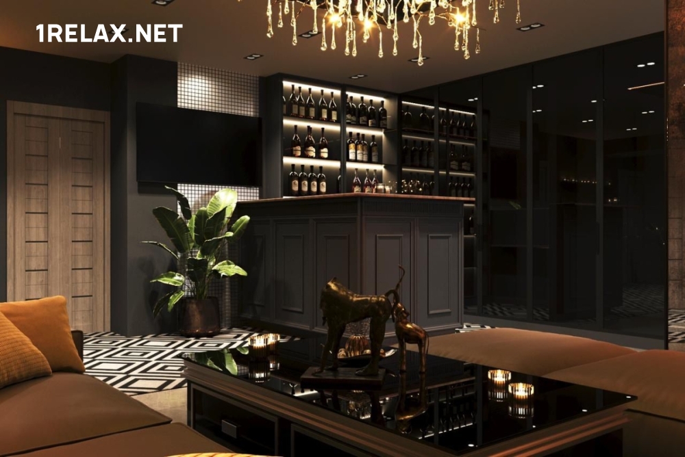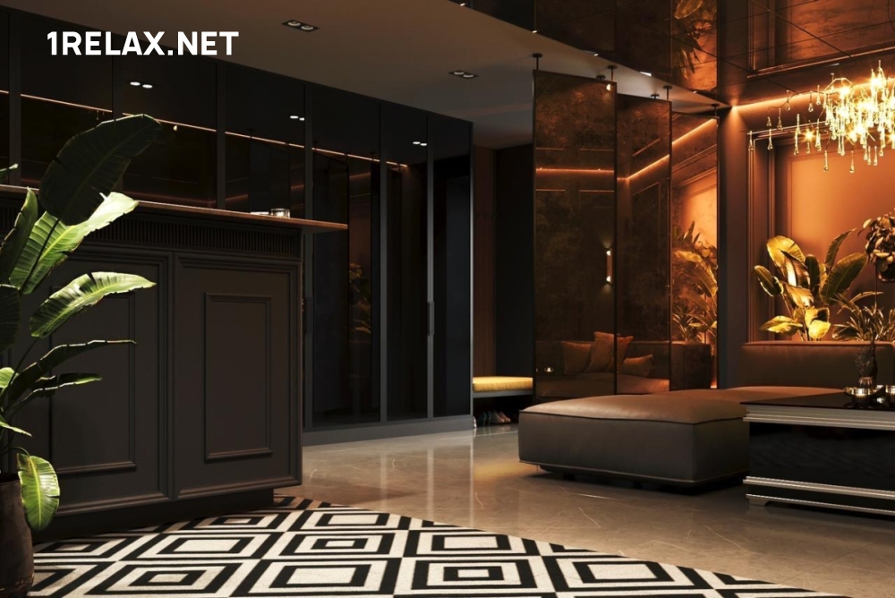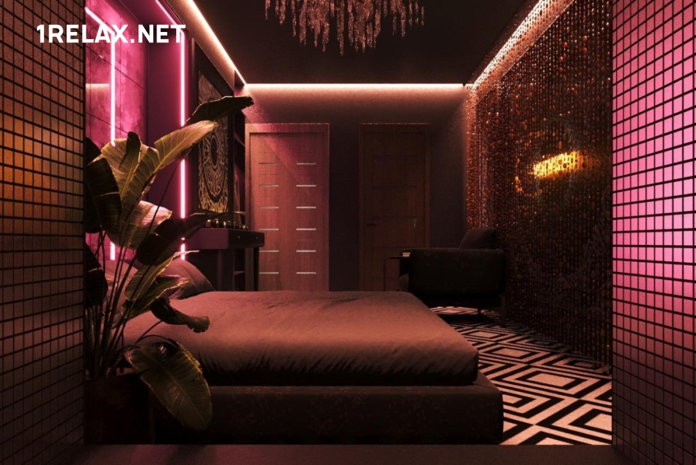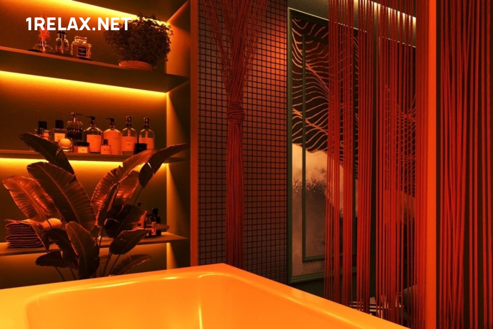В спа салоне две комнаты, и интерьер обеих тщательно продуман. Большая ванна позволит расслабить мышцы, чтобы сеанс прошел успешнее. Оформление зеркалами даст возможность наблюдать за действиями массажистки.